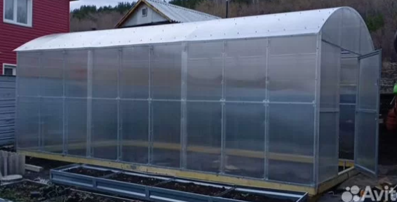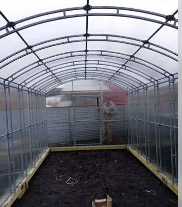 Ширина каркаса 3 метра, высота 2,45 метра, длина 4/6/8/10/ метров. Дуги и перемычки скреплены между собой краб-системой, две двери с форточками.